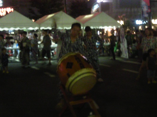 夜、屋台で買い食いしながら盆踊りを見ていました。
